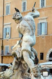 La mattinata è stupenda , piccoli cirri , come batuffoli di ovatta , vengono trasportati nel cielo di un azzurro mariano che accoglie il mio sguardo estasiato e grato per tanta bellezza divina profusa nella magia di questa piazza ( Navona ) . Seduto sulla panchina , anche essa marmorea , d'incanto mi trovo immerso in una "marmoreità" fuori del tempo . Mi sembra di vedere il "Virat" muoversi , il vischioso polipo agitare i "tentacoli" nel tentativo di avviluppare il palestrato eroe che si appresta a fiocinarlo .